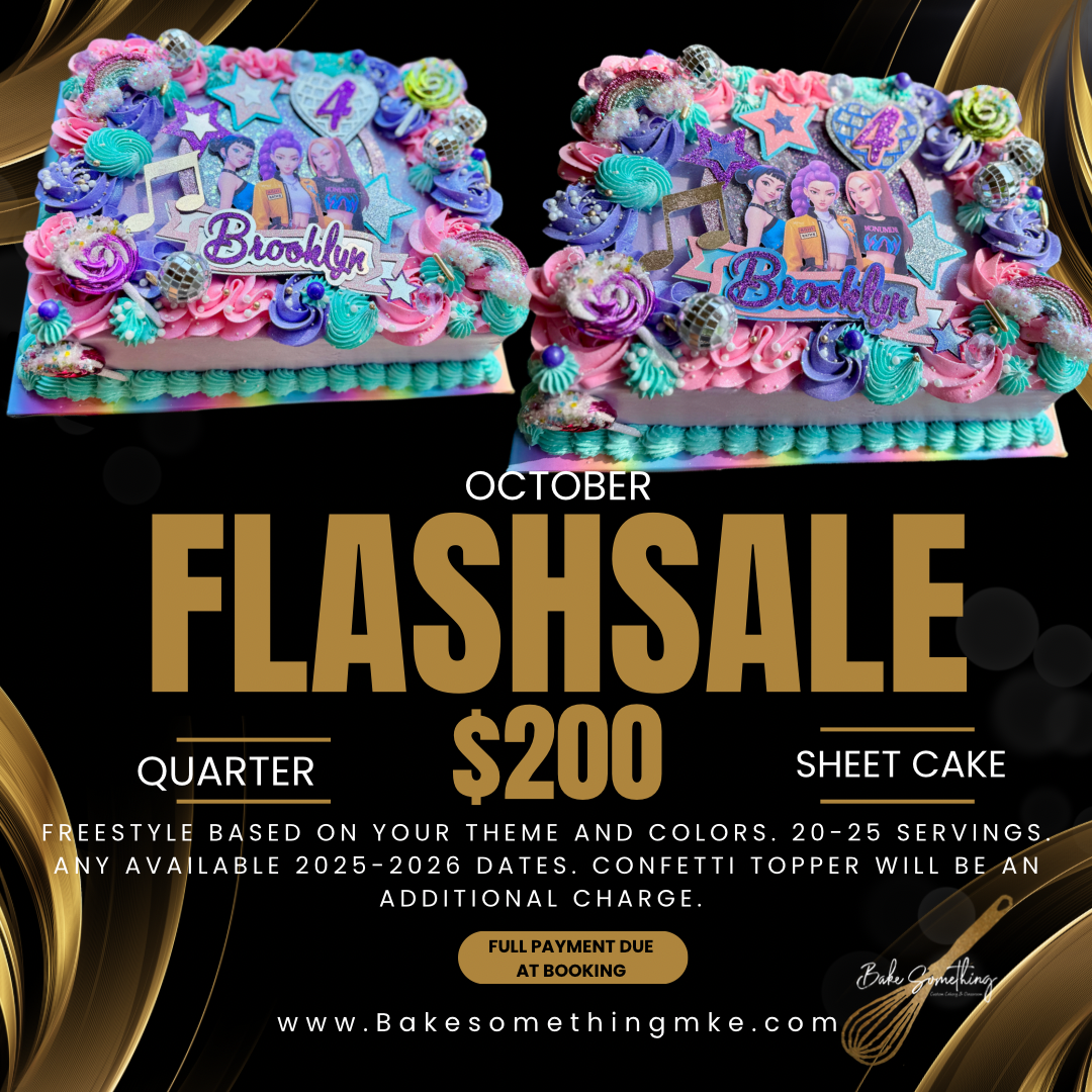 This package includes a quarter sheet cake serving 20-25 people. Over $100 in savings! This is a freestyle design, meaning you tell me your theme and/or colors and let me work my magic! This deal must be booked at least 1 week in advance.