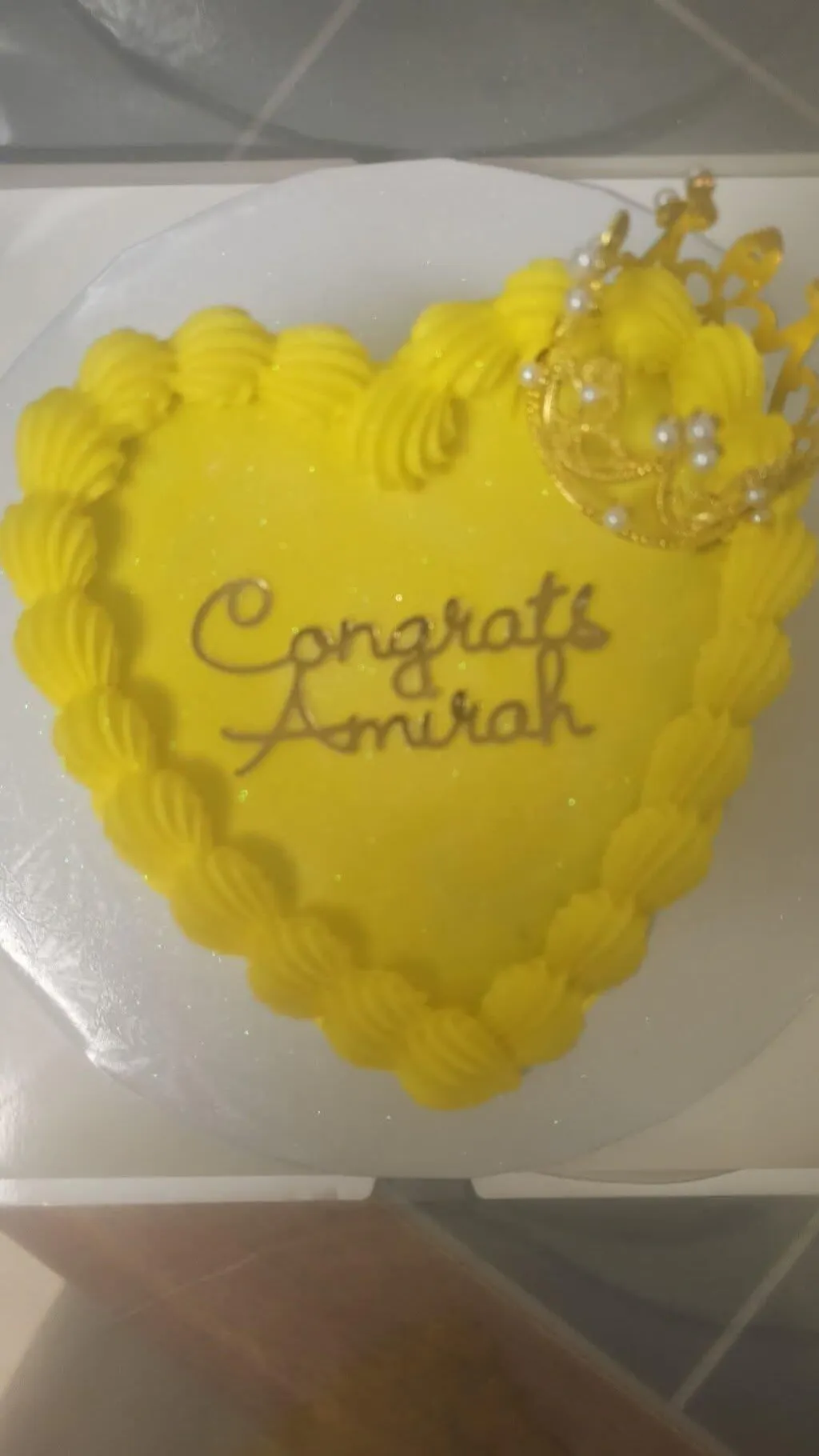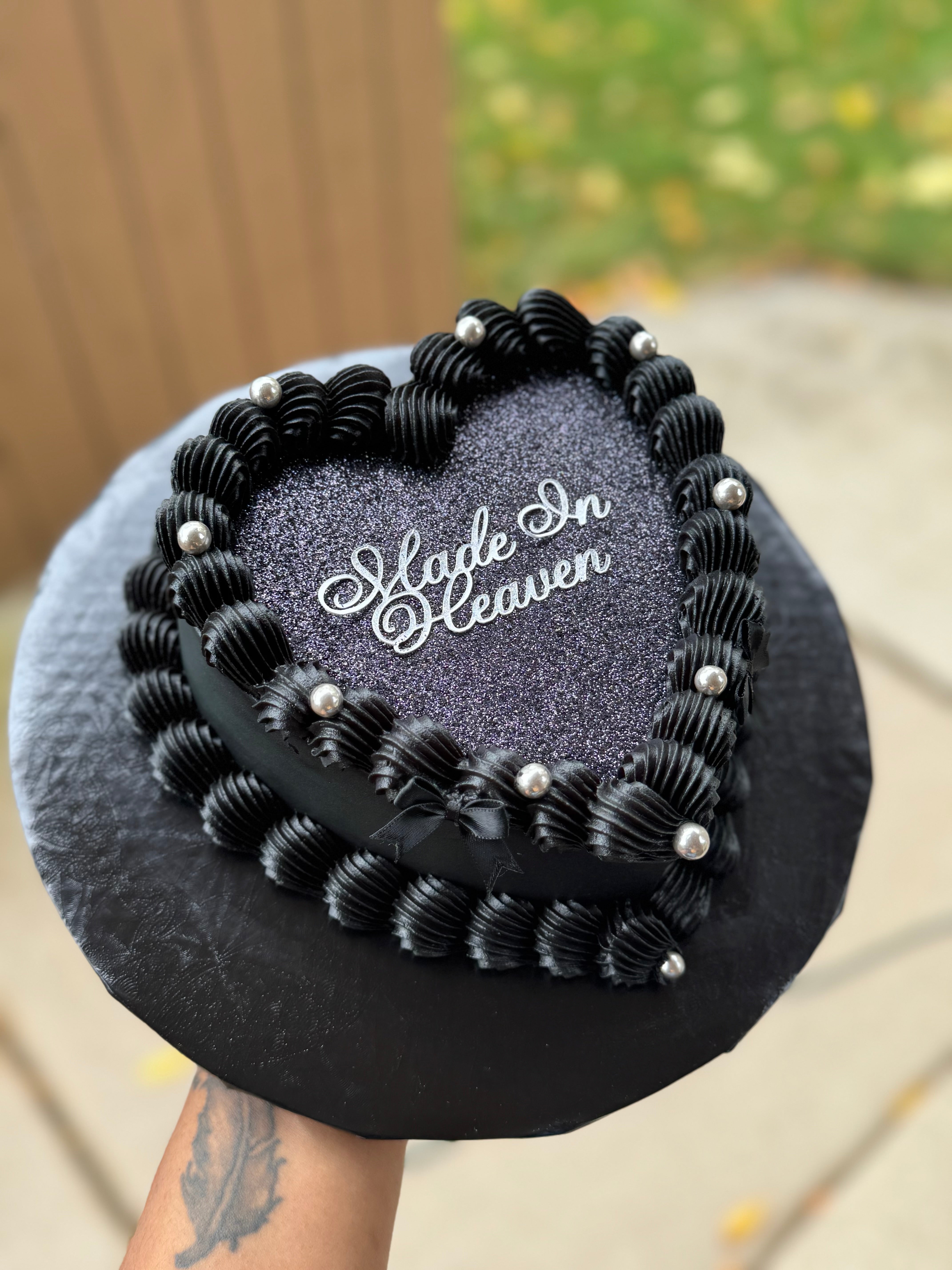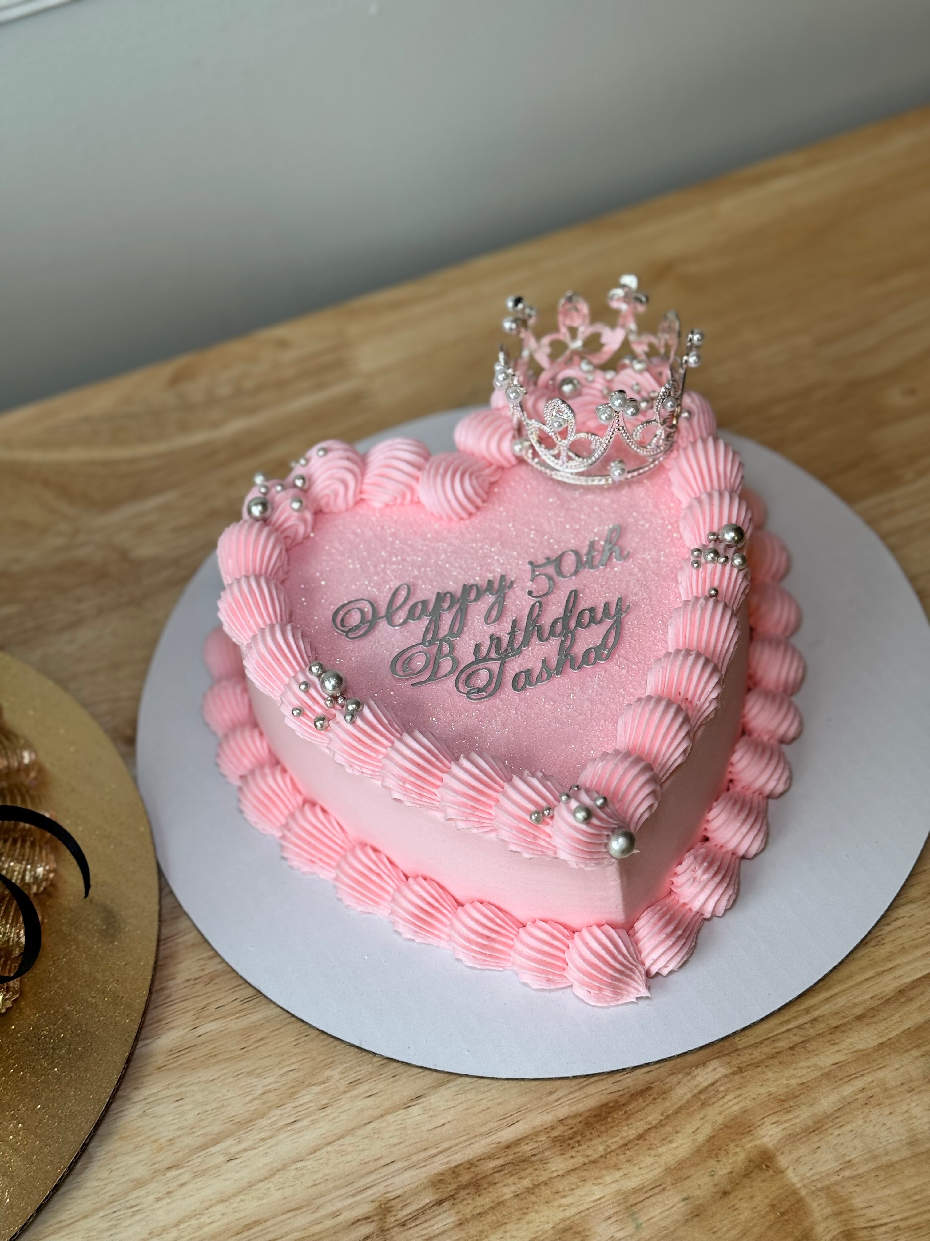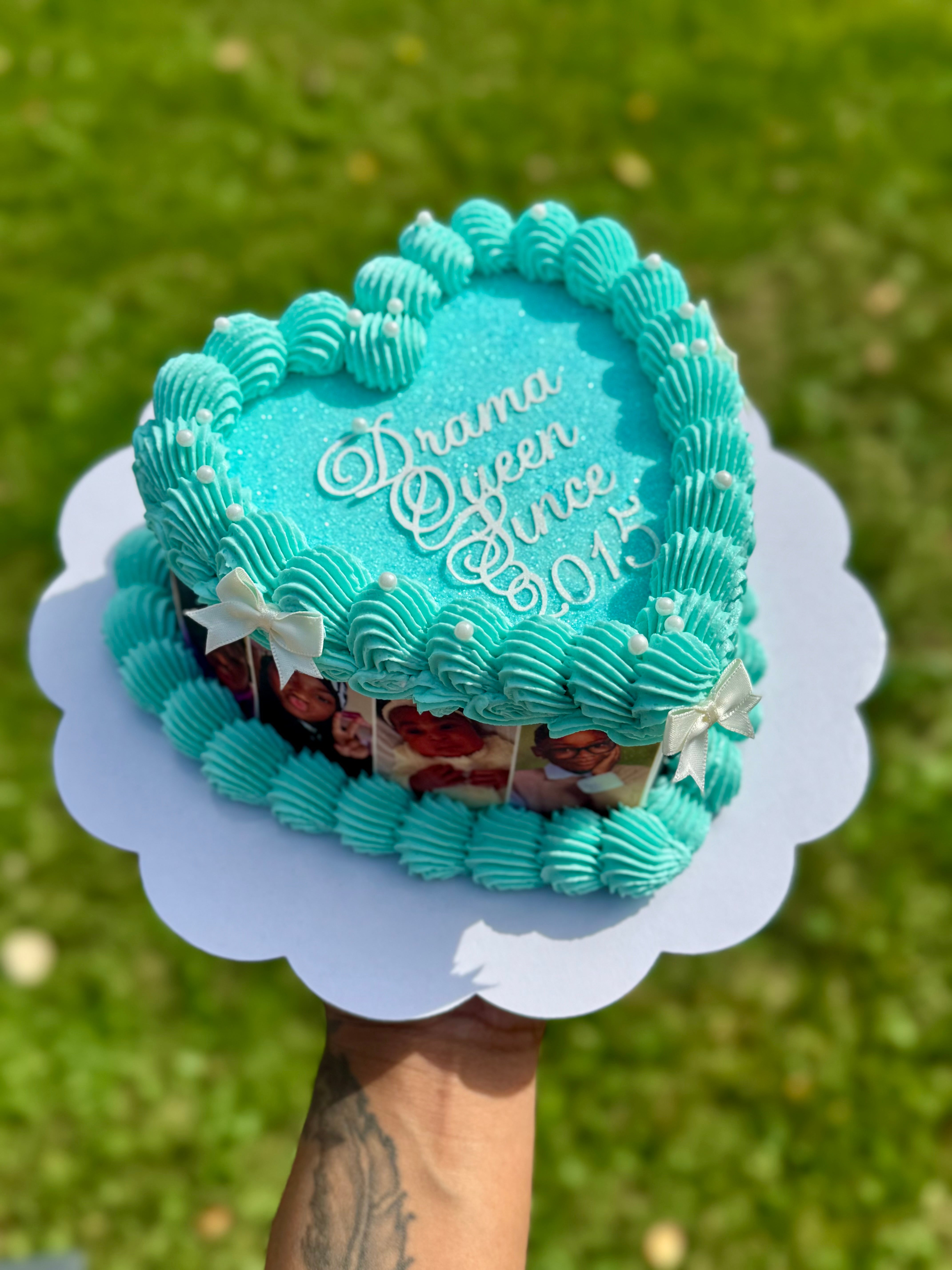 This is perfect for a personal cake or small gathering. Please keep in mind that this is a SINGLE LAYER heart cake. Serving 5-7 people. Glitter and wording included. Additional customizations are an additional charge.